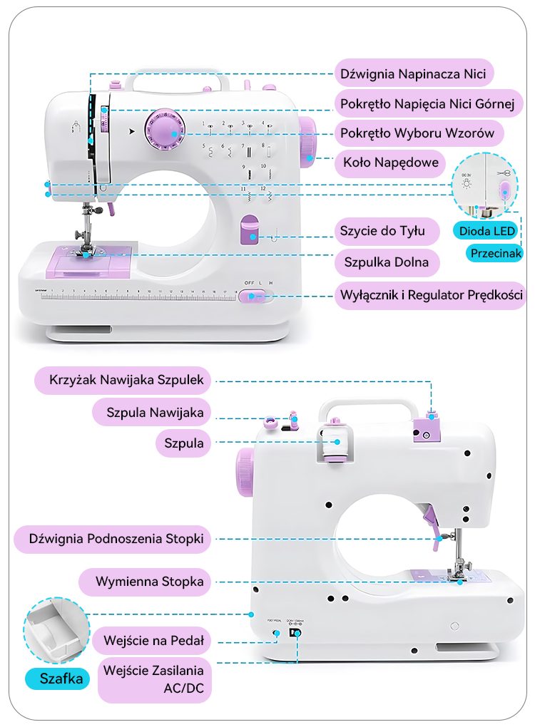 Podstawowe funkcje: Umożliwiają łatwe wykonanie owerlokowania, szycia dziurek i prostego szycia.