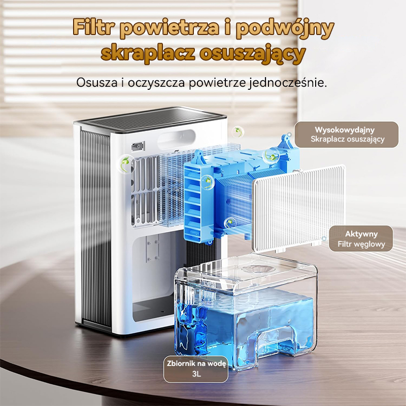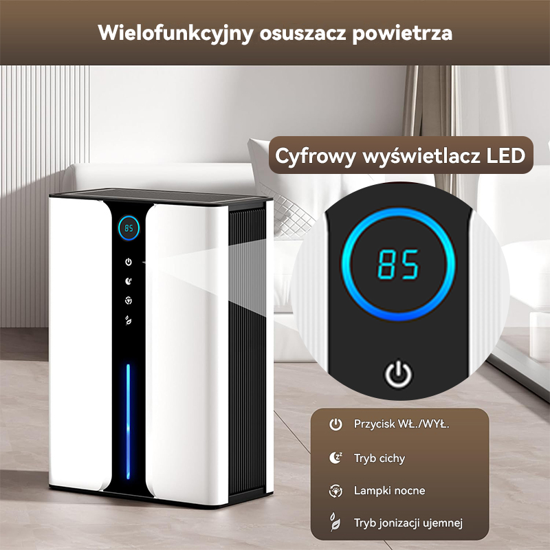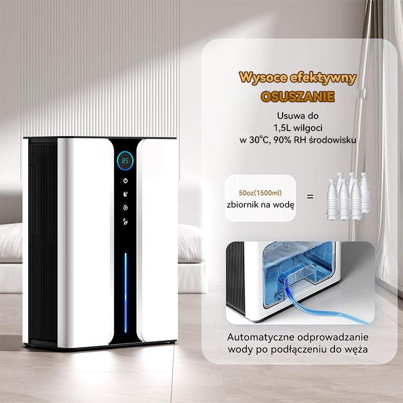 Cechy dodatkowe: Cicha praca, Duży wyjmowany pojemnik na wodę 3l, Wydajne osuszanie 1500ml/24h, Wyświetlacz LED