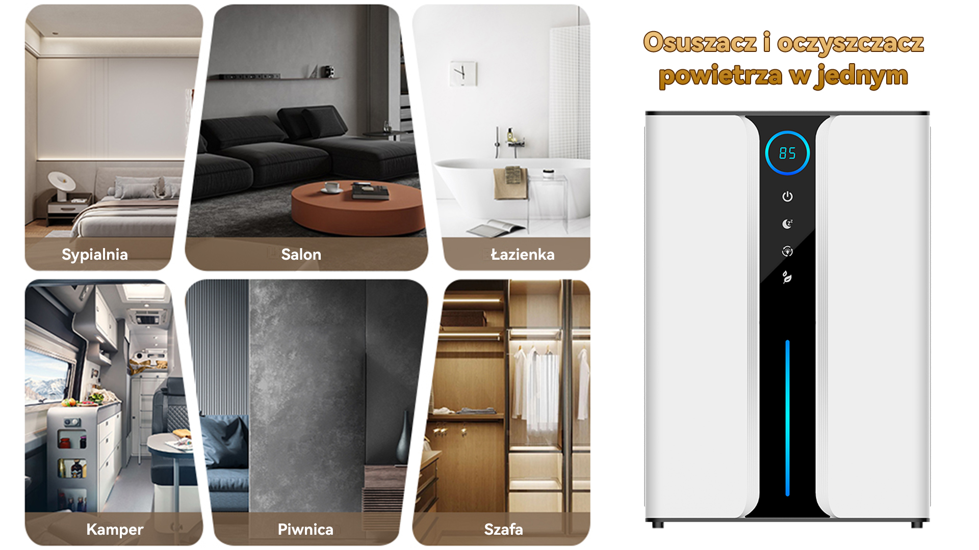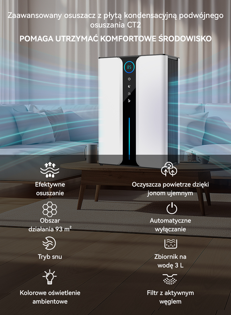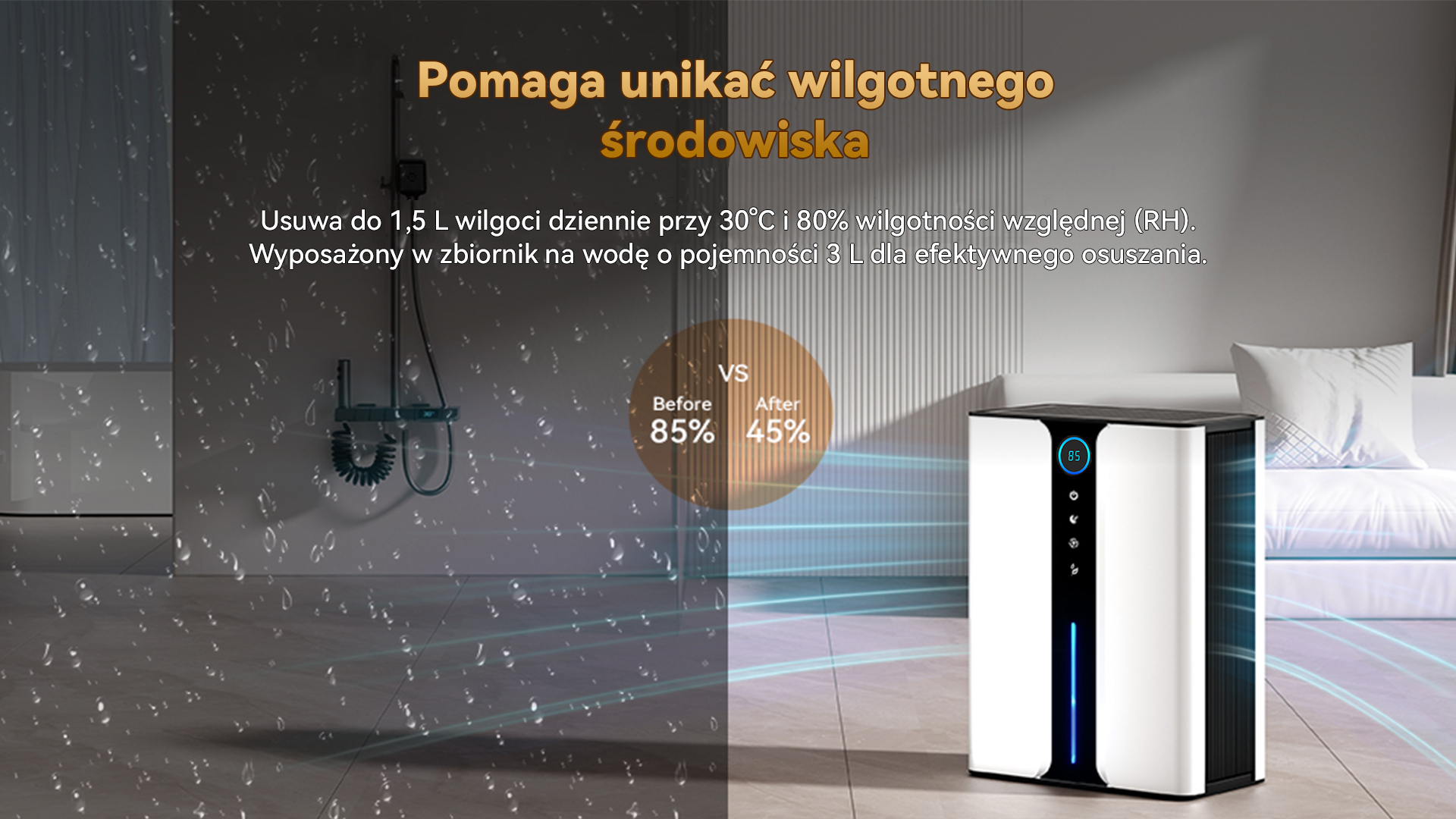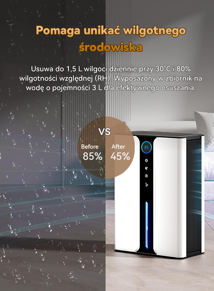 Wysysa wilgoć z powietrza, aby zapewnić większy komfort w pomieszczeniu dzięki wysokowydajnej technologii osuszania.