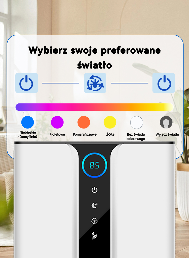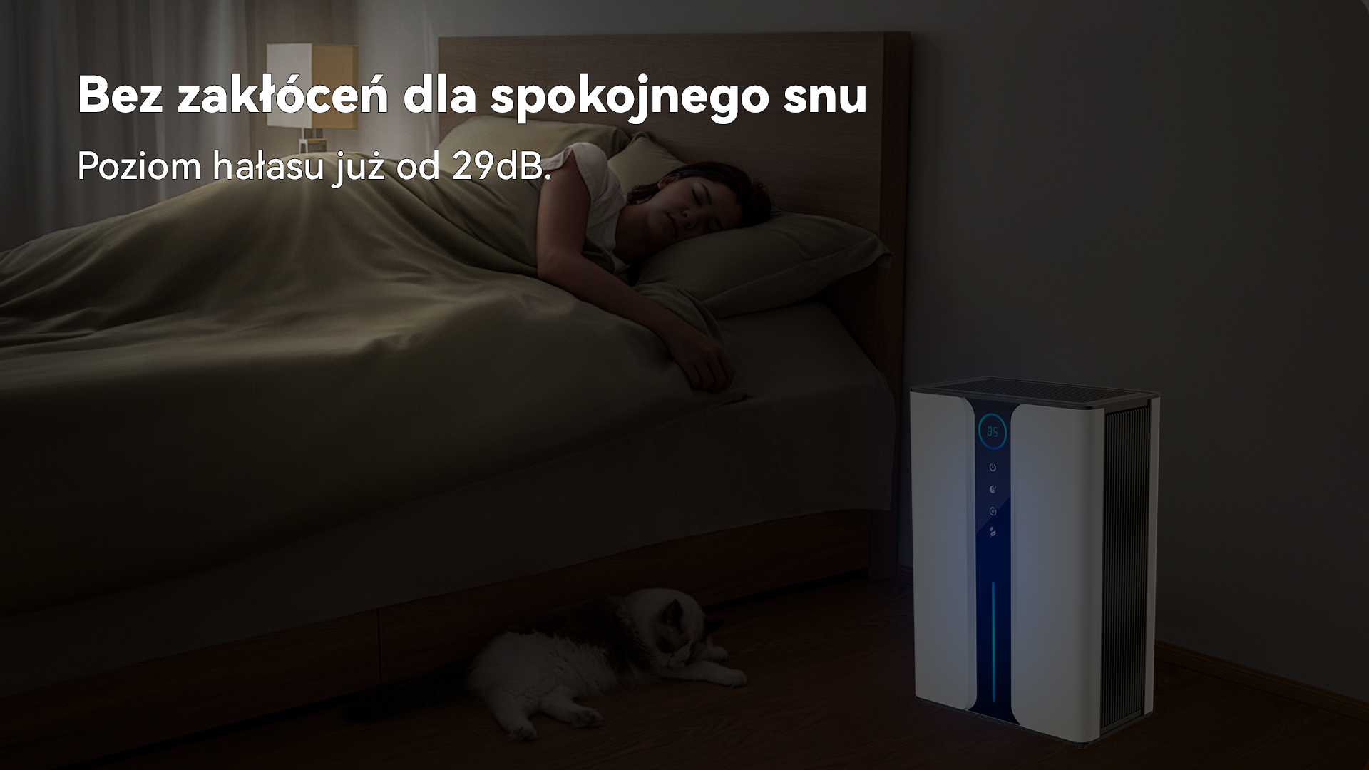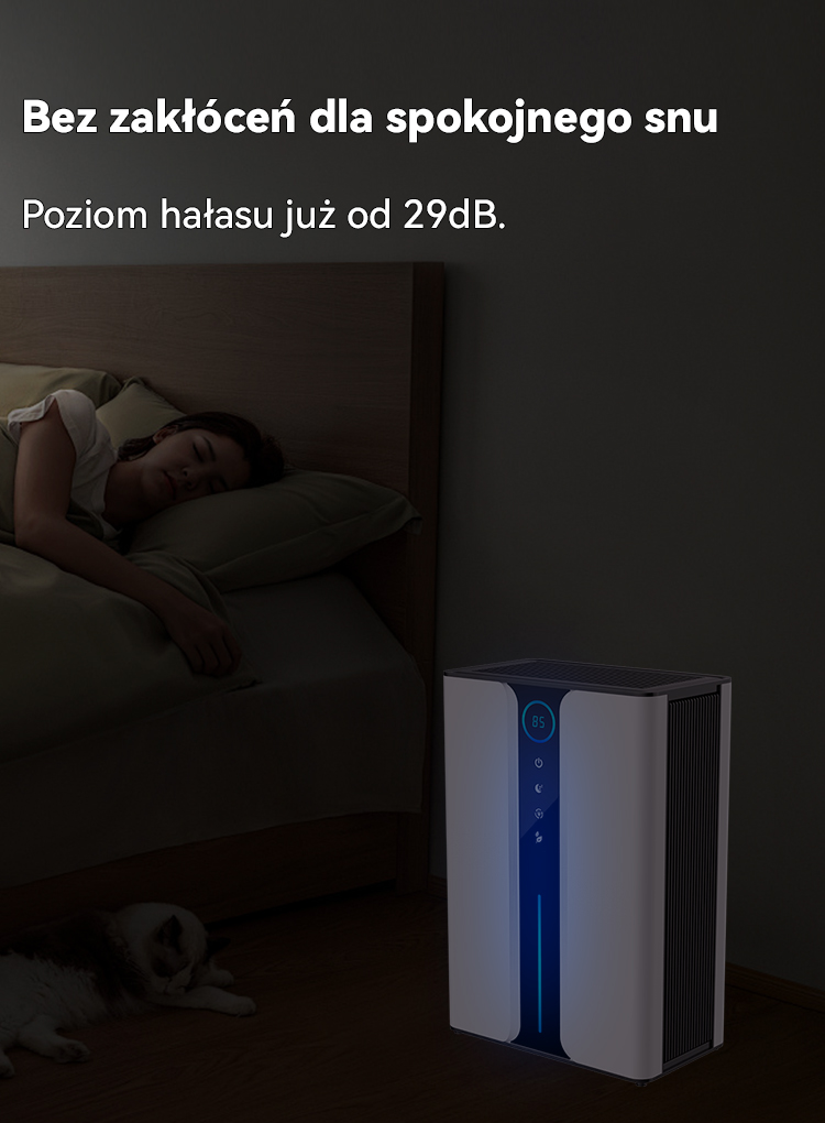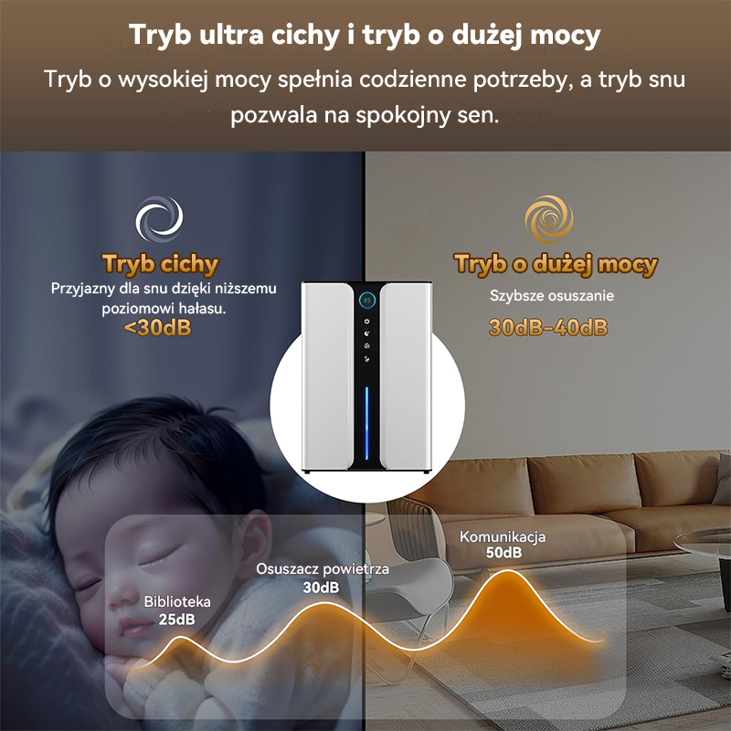 Osuszacz oferuje tryb o dużej mocy, który skutecznie redukuje wilgotność, szybko eliminując nadmiar wilgoci. Dodatkowo posiada tryb snu z wolniejszą pracą (<30 dB), co umożliwia cichą pracę w trakcie snu. Użytkownik może swobodnie przełączać się między trybami, w zależności od potrzeb.