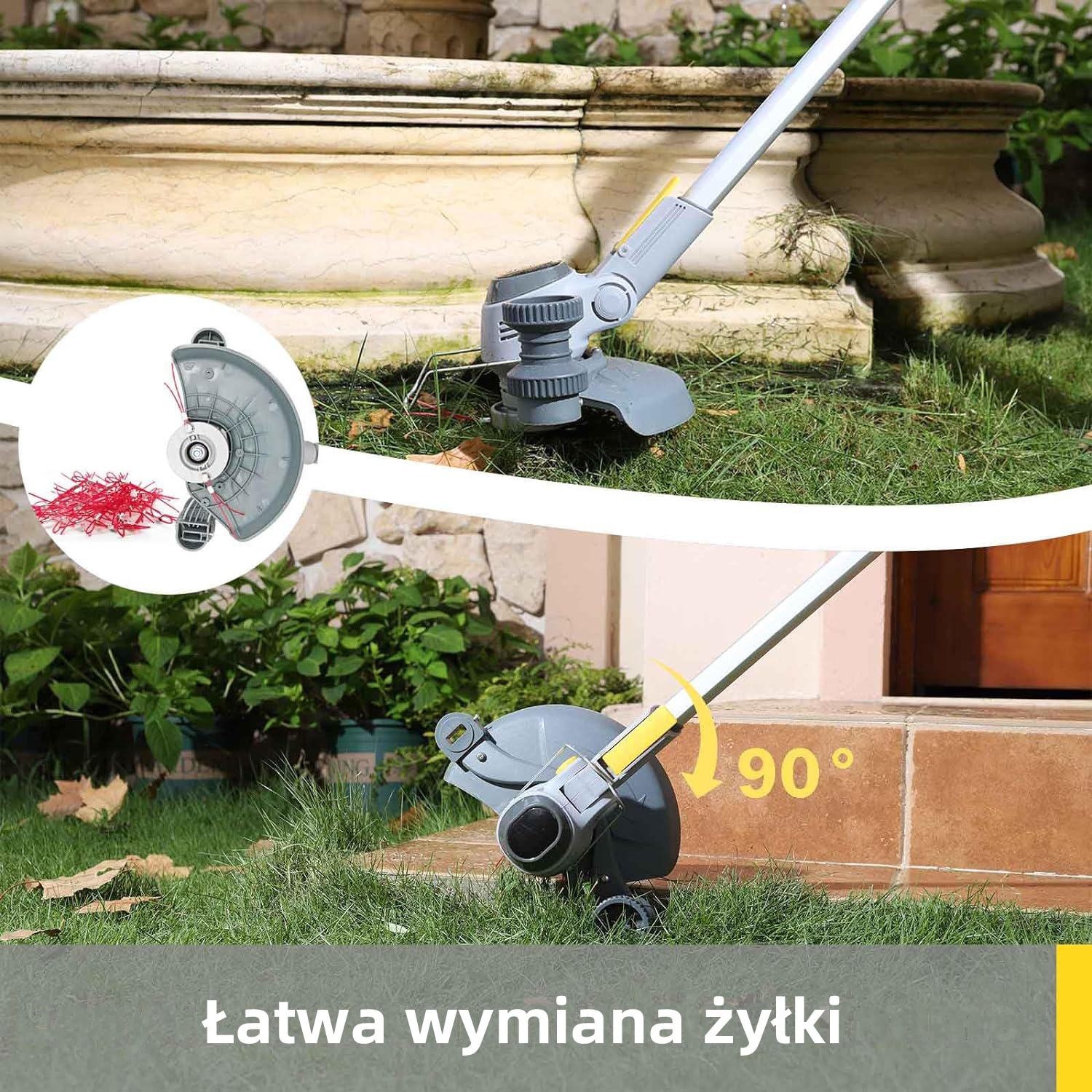 Głowica tnąca może być ustawiona pod 5 różnymi kątami (0° / 22,5° / 45° / 67,5° / 90°). Dodatkowo, obrót głowicy o 90° w prawo pozwala natychmiast przekształcić podkaszarkę w narzędzie do przycinania krawędzi. Drugi dolny uchwyt można dostosować do współpracy z górnym uchwytem, co pomaga zrównoważyć ciężar urządzenia i umożliwia łatwe przemieszczanie go do przodu i do tyłu, zgodnie z Twoim wzrostem oraz potrzebami cięcia.