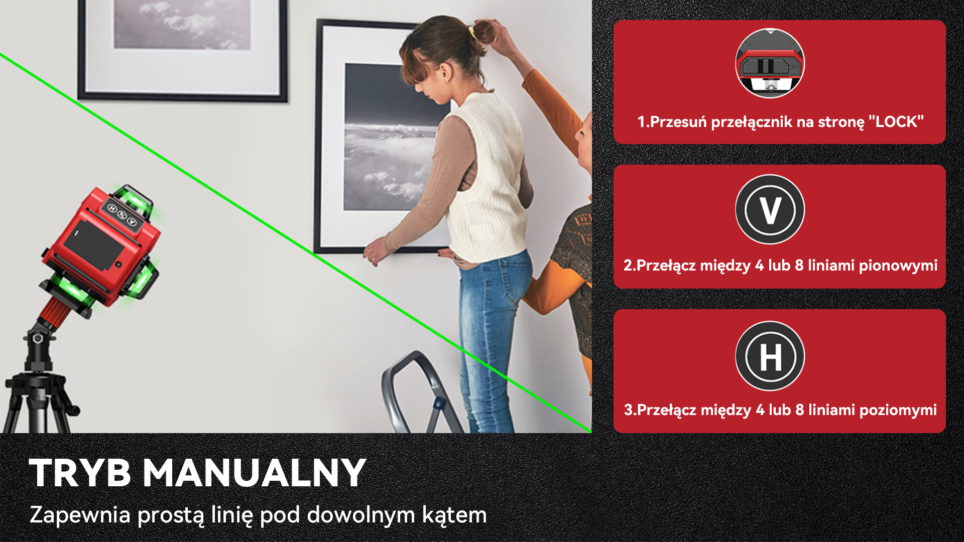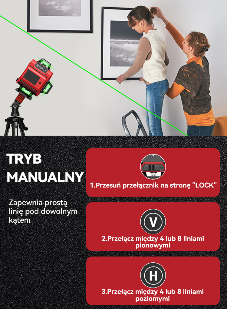Poziomica laserowa 4D z przełącznikiem suwakowym umożliwia ustawienie 2 trybów. Rozlegnie się sygnał dźwiękowy, a wiązka lasera będzie szybko migać, gdy narzędzie znajdzie się poza zakresem samopoziomowania ± 4°. Zablokowanie przełącznikasu wakowego aktywuje tryb ręczny, dzięki czemu linie można zablokować pod innymi kątami w celu ręcznego wyrównania, co jest często wymagane w projektach dekoracyjnych.