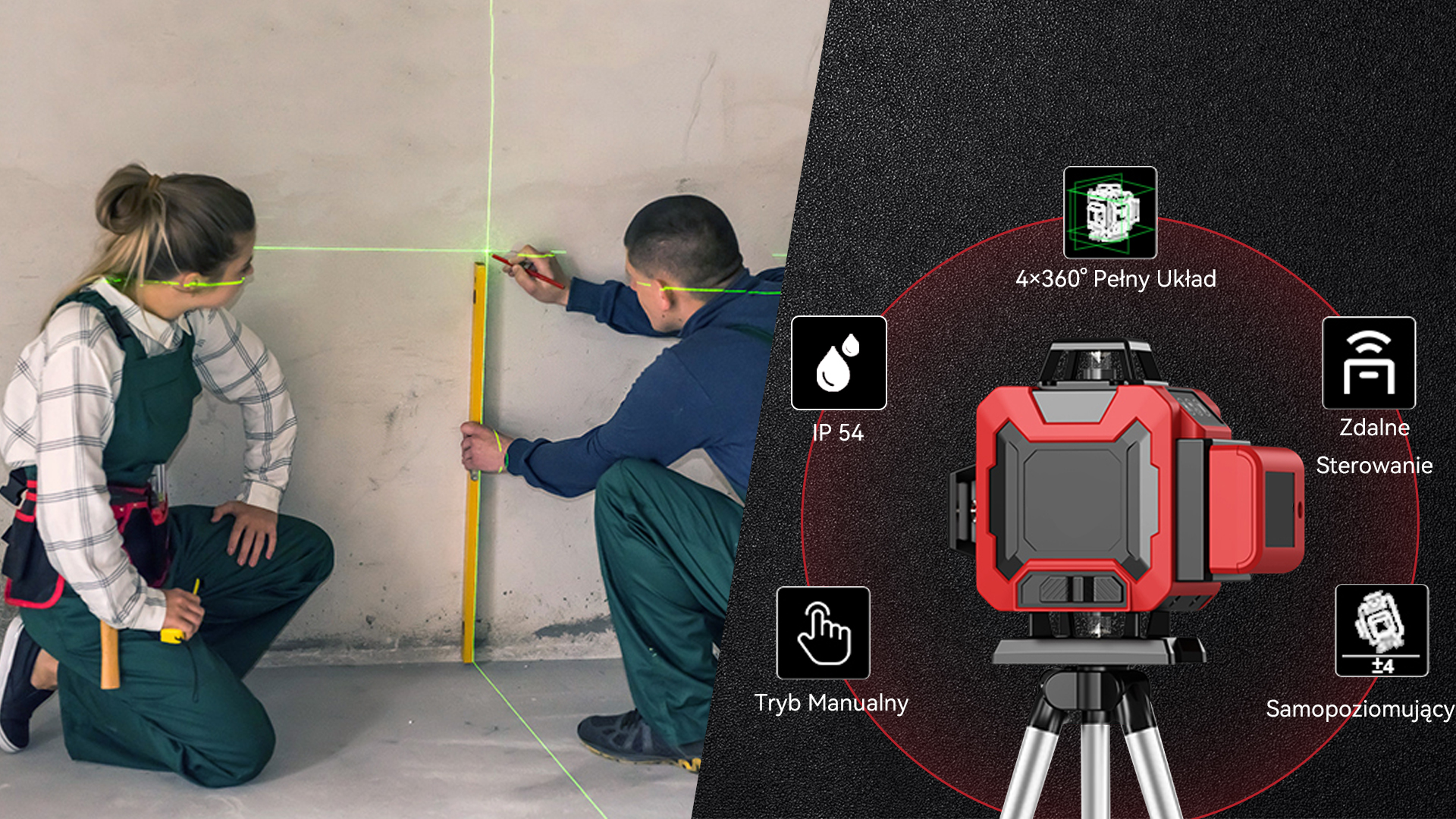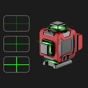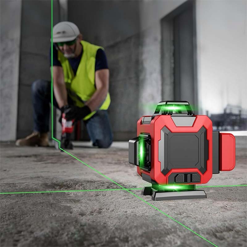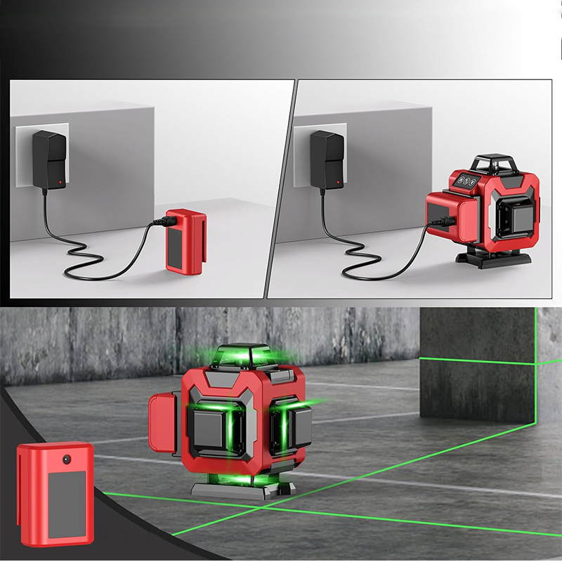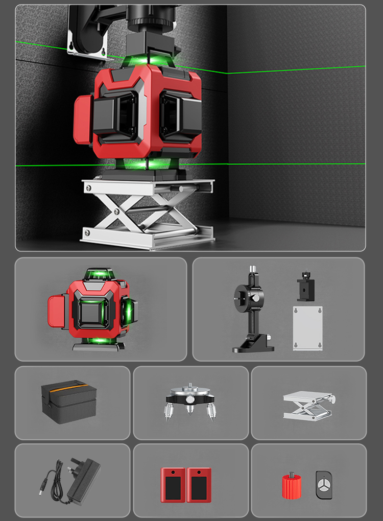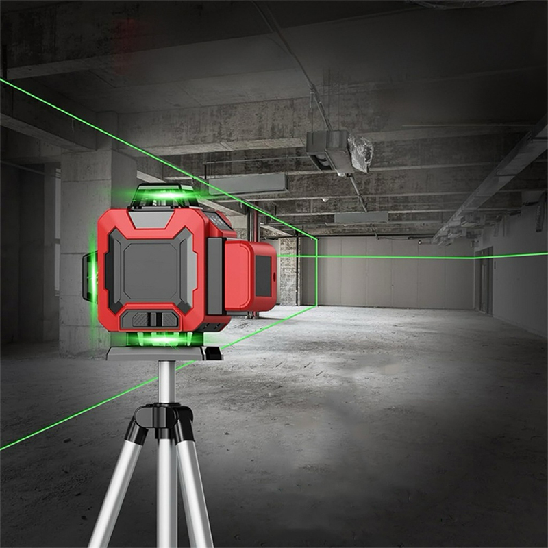Poziomica laserowa 4D z 16 liniami może wyświetlać 16 niezależnych linii, co pozwala na pomiar poziomej linii całego pomieszczenia jednocześnie, oszczędzając czas i wysiłek. Jest to narzędzie bardzo odpowiednie do użytku w budynkach, dekoracji wnętrz, kolejnictwie, na drogach oraz do tynkowania zewnętrznych ścian.