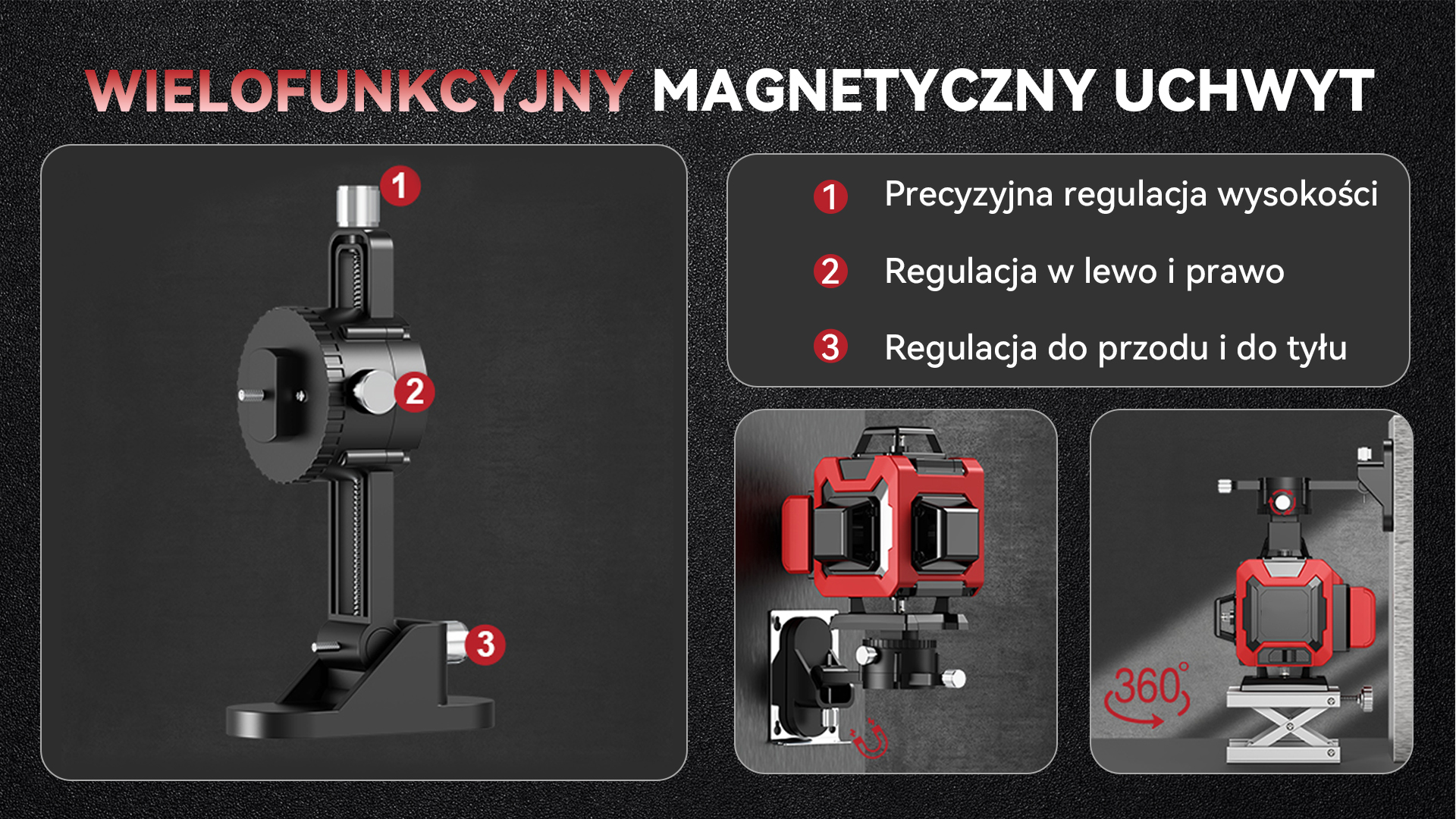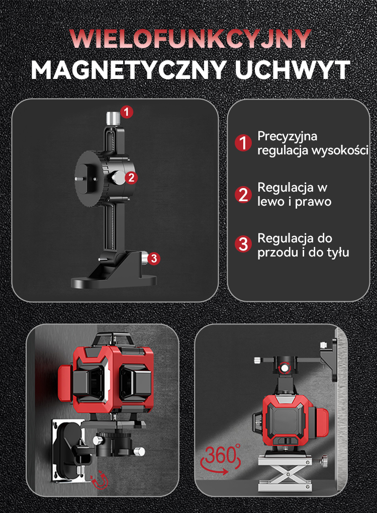 Urządzenie jest kompatybilne z statywami o gwincie 1/4" oraz 5/8". Różnorodność opcji montażu sprawia, że jest to wszechstronne i łatwe w obsłudze narzędzie. Dzięki prostej obsłudze, urządzenie wykonuje trudną pracę, zapewniając idealne wyrównanie bez potrzeby dużego wysiłku z Twojej strony. Solidny uchwyt montażowy zwiększa wszechstronność, umożliwiając łatwe mocowanie do różnych powierzchni.